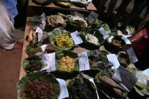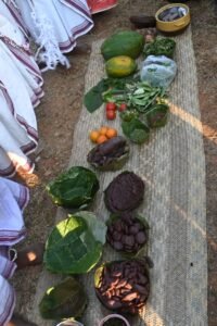 We did similar Gram Sabhas in in Majhgaon Tanginath, Bandhua, Dumri, Mandharia and Rata silly villages. We had our lunch in Bandhuwa  folowed by moved to SANKHSARDHI Gram Shabha for meeting. We moved further to  Rata Silli village for our night stay.  To our surprise  a grand welcome was organized in our honour.   We reached the village late but could found that the entire village was waiting on road for our arrival. With welcome songs and band they took us to the venue. It was really a grand reception with their traditional custom of receiving the guest by washing our hands and legs (padya and arghya) followed by patting with dry towels. They also arranged an exhibition of agricultural tools they use; various artifacts they prepare and about 50 various food dishes    sourced from their cultivation and forest biodiversity. They served the same food to all the participants in dinner. I missed the test since now-a-days I stopped taking food after sunset.  We also felicitated a 110+ aged women in the village along with nearly 40 persons for their excellent work..