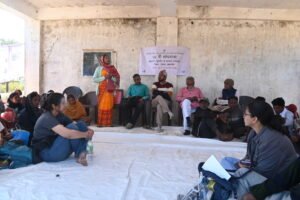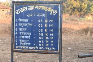 After paying floral respect in both the places, we started our journey to Srinagar village where our breakfast was waiting for us. Breakfast, to be mentioned,  was great with local grains and also some kind of Kheer with local grains. We all enjoyed the breakfast in Sal leaf  plates. Our next destination was Chainpur Gram Sabha. We hand our lunch in the same Gram Shabha  and after meeting with the villagers. We moved to Duhudar-gaon through a beautiful scenic track of river and forest. We also cross a sub-divisional place where schools were available. We spent some time in the school interacting  with the children.  At Duhadur-gaon, we had meeting first with the villagers and thereafter had our simple lunch; rice, dal and a vegetable in Sal leaf plate. We moved to next village Jaipur/Tilbar and from there Malam panchayat. It was late evening,  yet  villagers were waiting for us. We had our meeting first and then retired for the day after having modest dinner. We were accommodated in three rooms of Gram Sabha meeting hall.