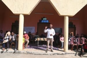 We reached the destination after a brief break for lunch in a Haat (Local weekly market) and for some photography at about 3:30 pm. There was a meeting organized with the villagers at 4:15 pm. It went about an hour.  Stay arrangement was in a primary school where three rooms were available,  two for male and one for female  participants to be slept on floor. We were altogether 40 participants out of which 7 were females. Interestingly, the group comprised of 4 senior citizens of age  between 65 and 78 years to young students including 13-PGDM students and Ph.D. students of age 16 to 25 years; by profession, there were practicing organic farmers; professors; academicians, agricultural research manager, local artists, business professionals, journalists, etc.
